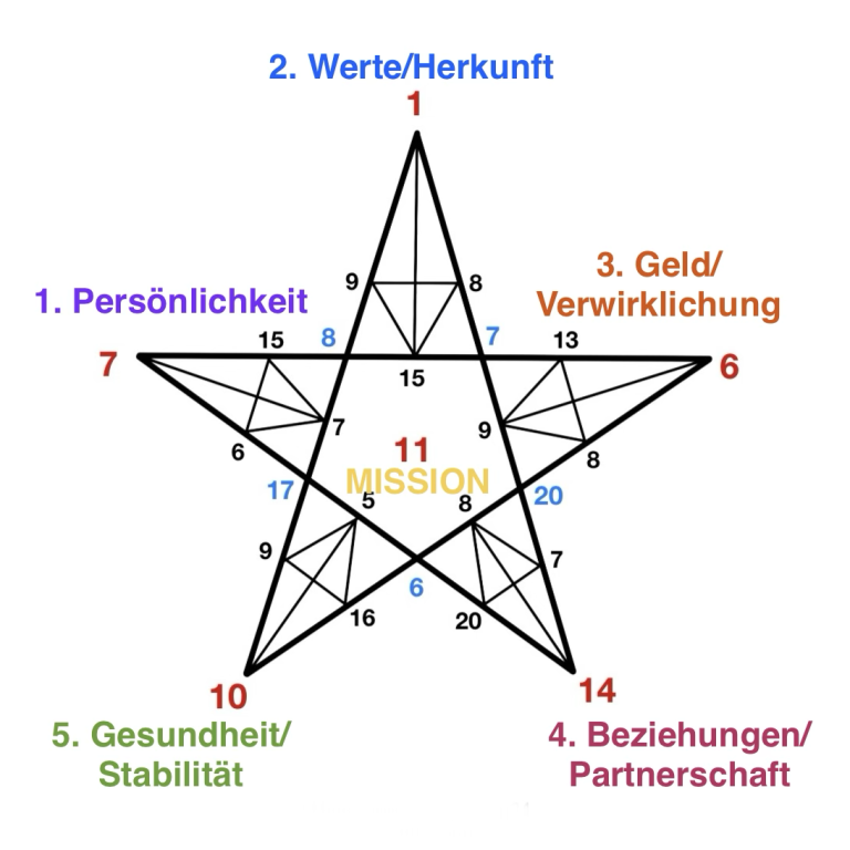 Durch die Berechnung und Analyse dieses Sterns lässt sich das persönliche Potenzial über verschiedene Lebensbereiche hinweg darstellen – etwa in Bezug auf Beziehungen, Beruf, Selbstorganisation, Kommunikation und Zielorientierung.